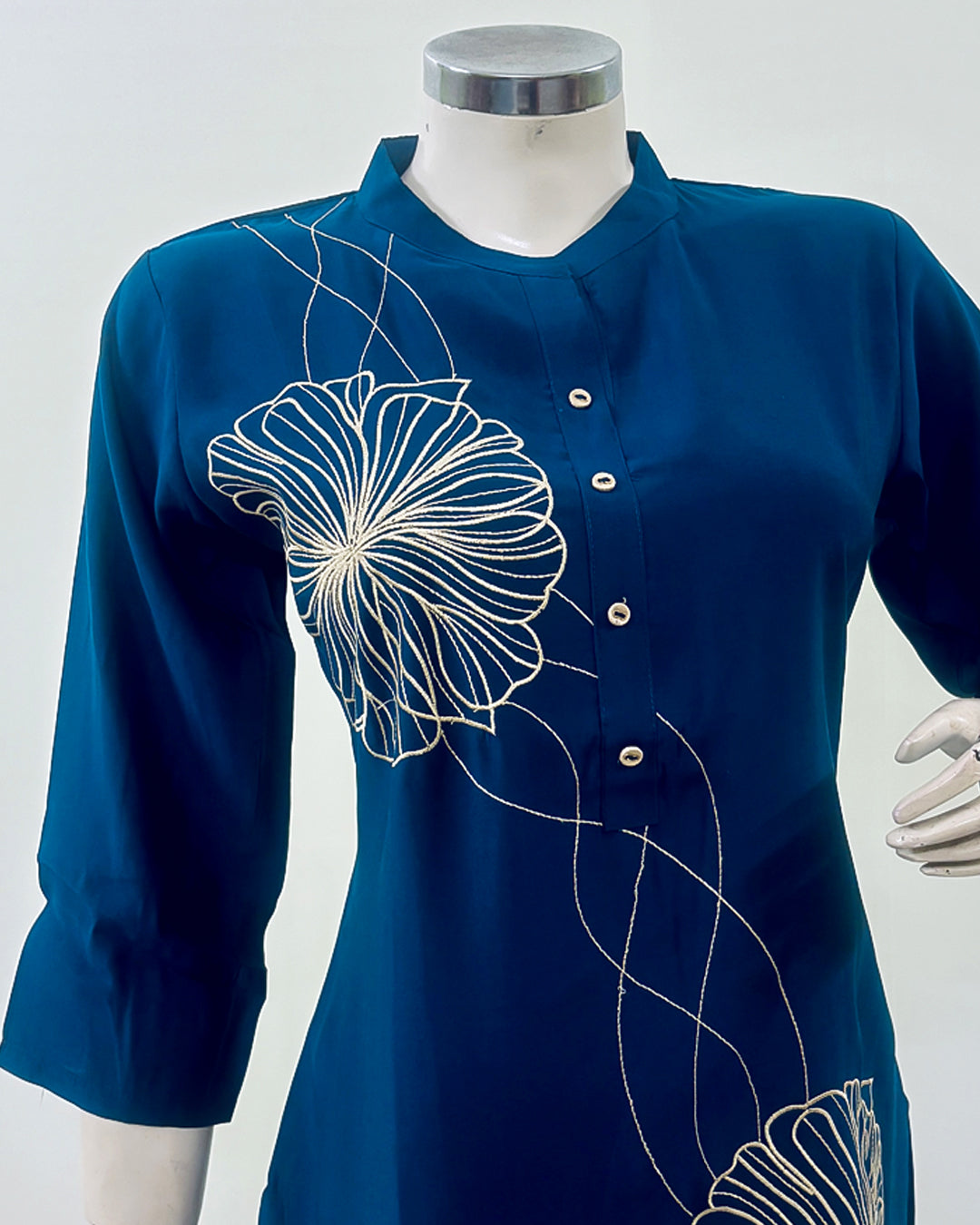 Step into refined elegance with this beautifully crafted Midnight Bloom Embroidered Co-ord Set. Made from soft, breathable fabric, this set features a modern straight-fit kurta adorned with delicate floral embroidery, paired with matching tailored pants, combining comfort with timeless style.